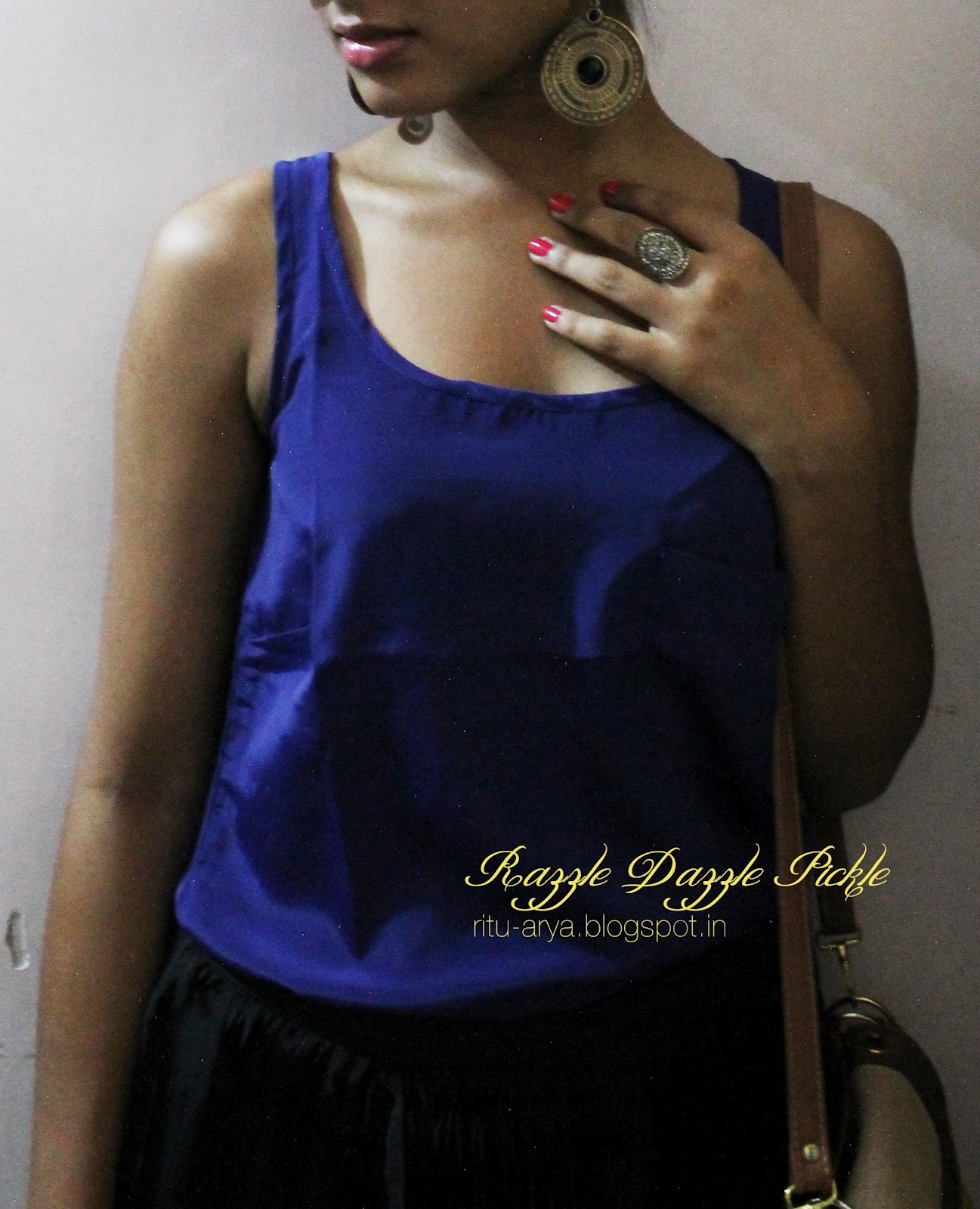 I am wearing this Black 'High-Low' Pleated skirt with a navy blue Vest top. Adding an Ethnic peck to it, are the Golden earrings, the Golden ring and my Yellow Sling bag along with my fav Golden Kolhapuris.